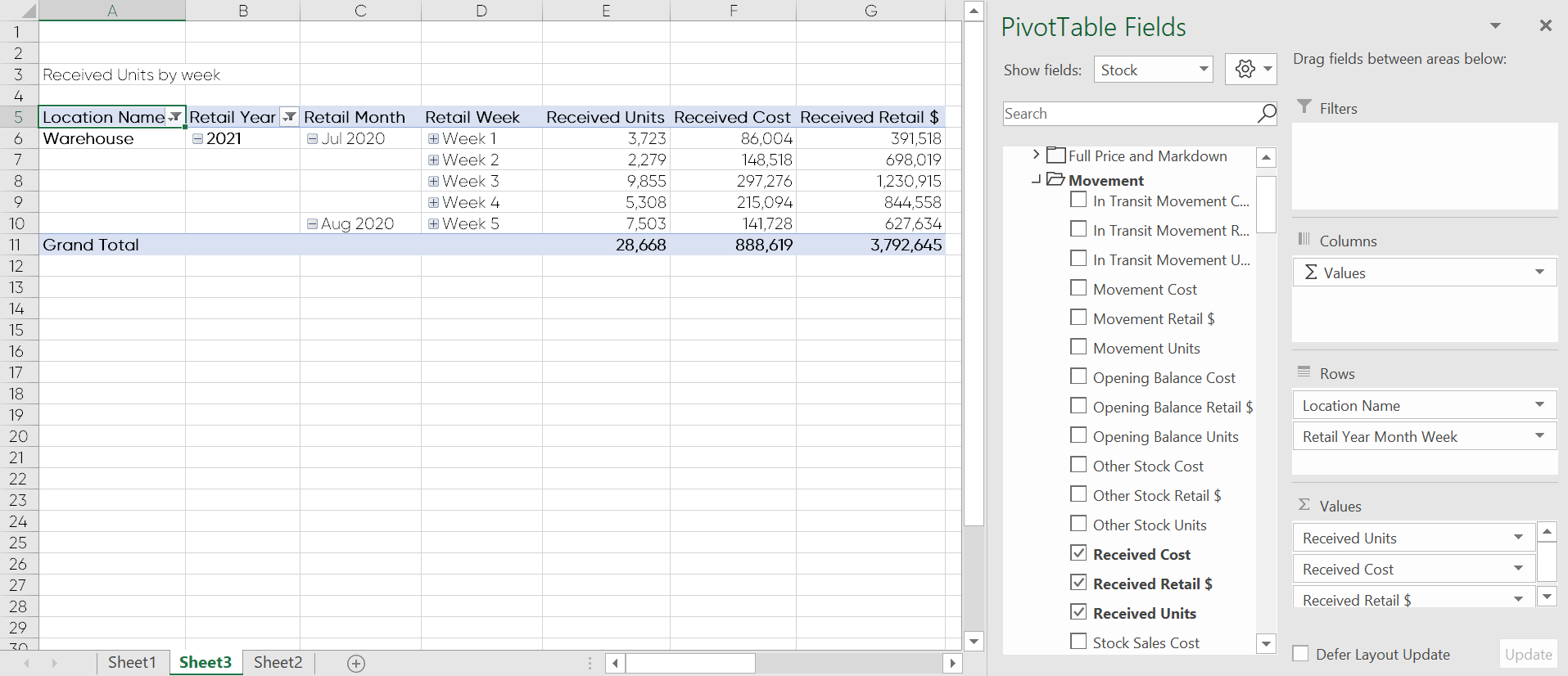You can view Received values against the actual receipt date in the Stock module under the Stock Movements folder. (see screen shot below)