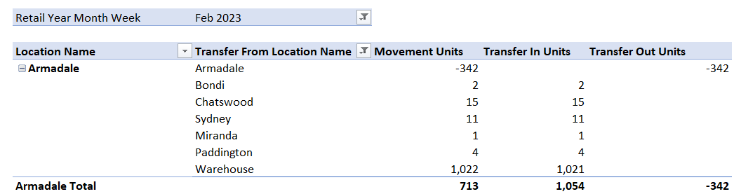 Stock is reported coming in against the receiving location. Stock going out shows as a negative number. Pull in 'Transfer from location name' to see where the stock was sent from.