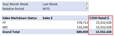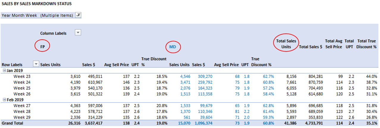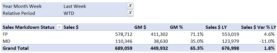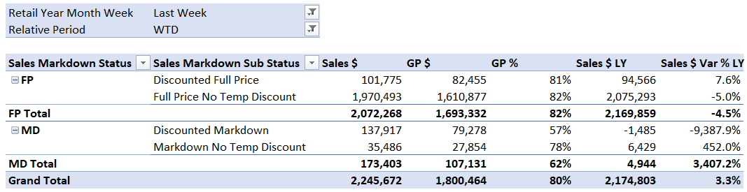 Full Price and Markdown Measures enable you to report on FP and MD Stock and Sales in the one report.