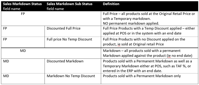 Sales Markdown Status reports the Full Price (FP) and Markdown (MD) Sales at the transaction level. As such, the transaction carries with it the details of the status of the sale at the time of the sale.