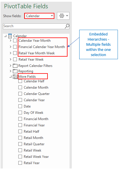 Defining the 3 calendar options available in the cube - Retail Calendar, Financial Calendar and Calendar (Gregorian).