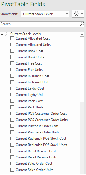 There are 2 means by which you can view your stock information. Select one of the below from the 'Show Fields' drop down box :