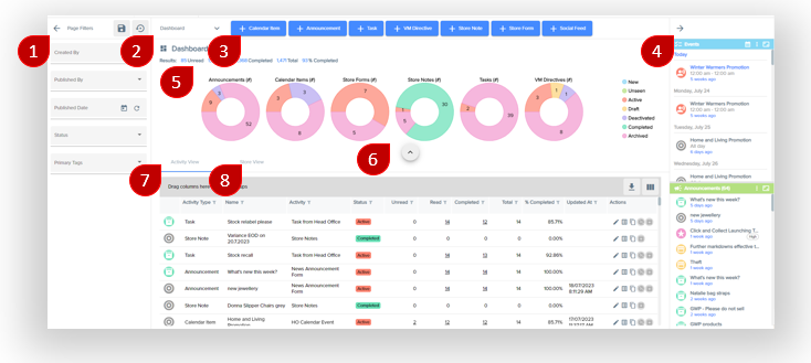 - The purpose of these charts is to provide a numerical summary of the amount of activities by status that is being used across the platform including whats New but not published, unseen, active, in draft, deactivated, completed and archived. These can also be controlled by the page filter status option.