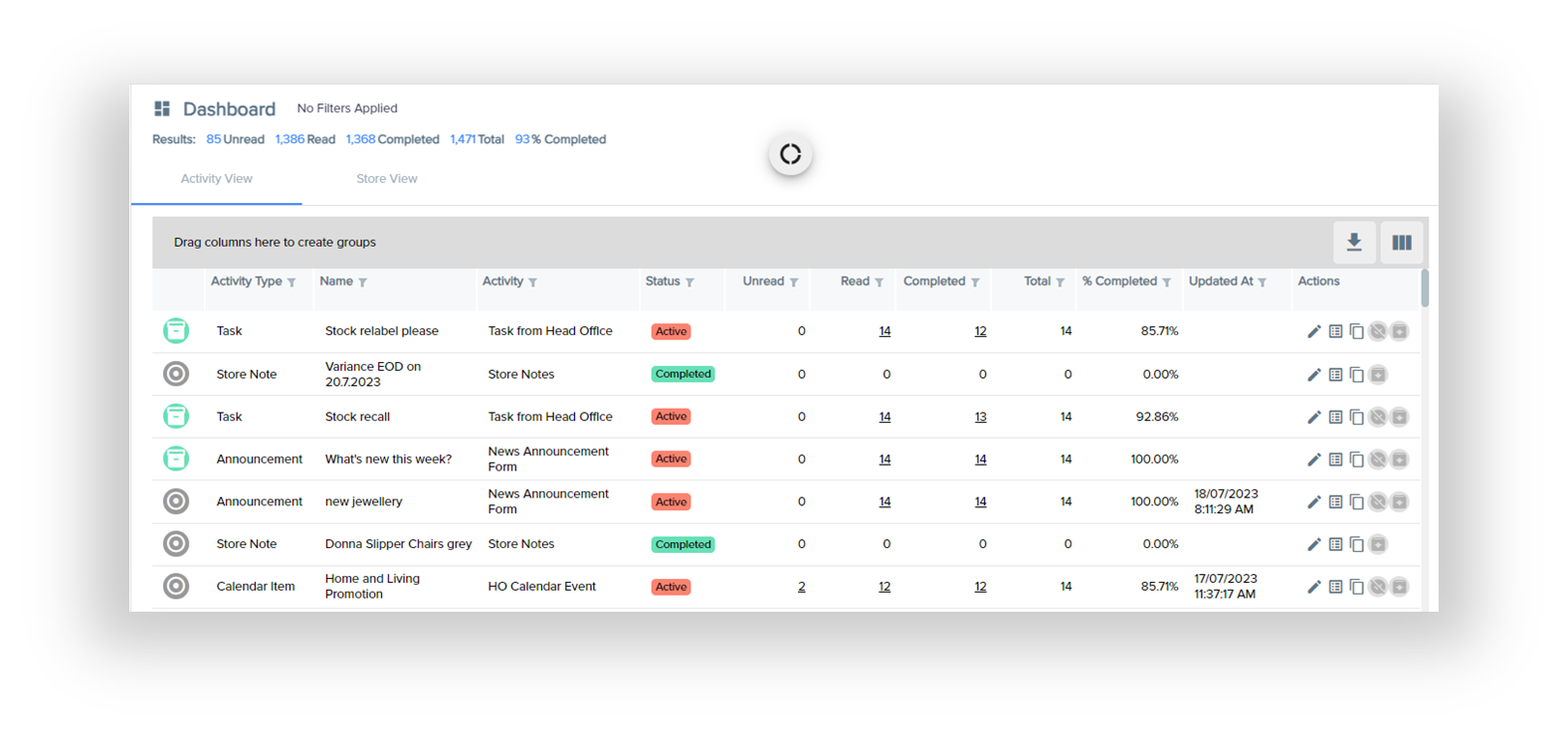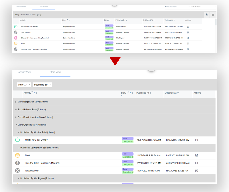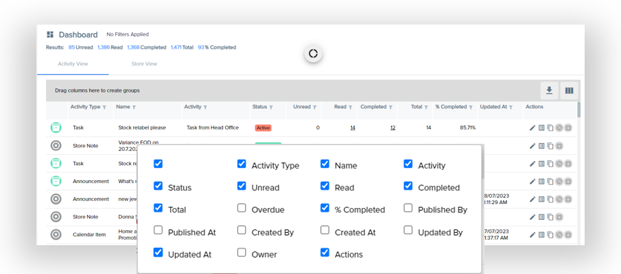 - This grid displays all the stores with two additional filters for Activity and Activity Name