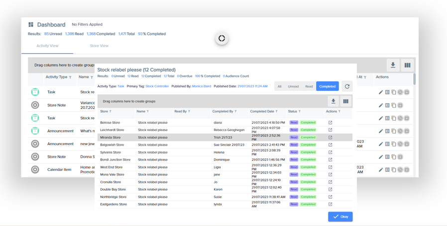 - Clicking on the status numbers, in the Actvity view will pop out the store list that meets that condition