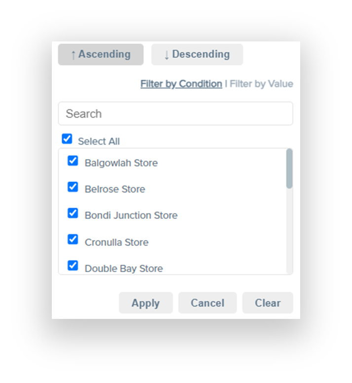 - Column Filtering - can be achieved by clicking on the filter icon in the heading