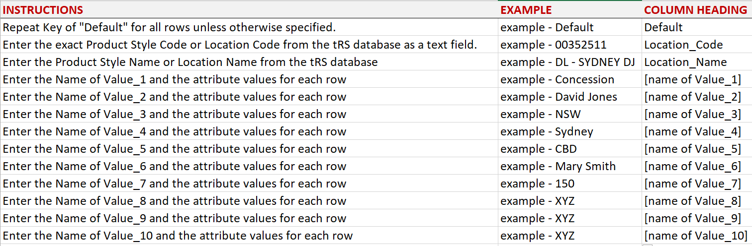 In summary, style product code (or what ever product level you are attributing) from your tRS data warehouse is in the rows with the custom attributes 1 to 10 as columns.