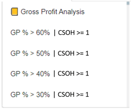 - I for instance could combine: GP % < 50% | Sales Units > 1 | CSOH > 1 into one Custom Sort Measure.