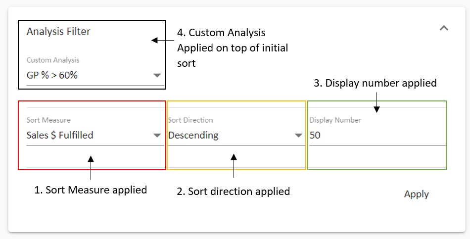 - 1. Apply a custom sort (eg Sales $ Fulfilled),