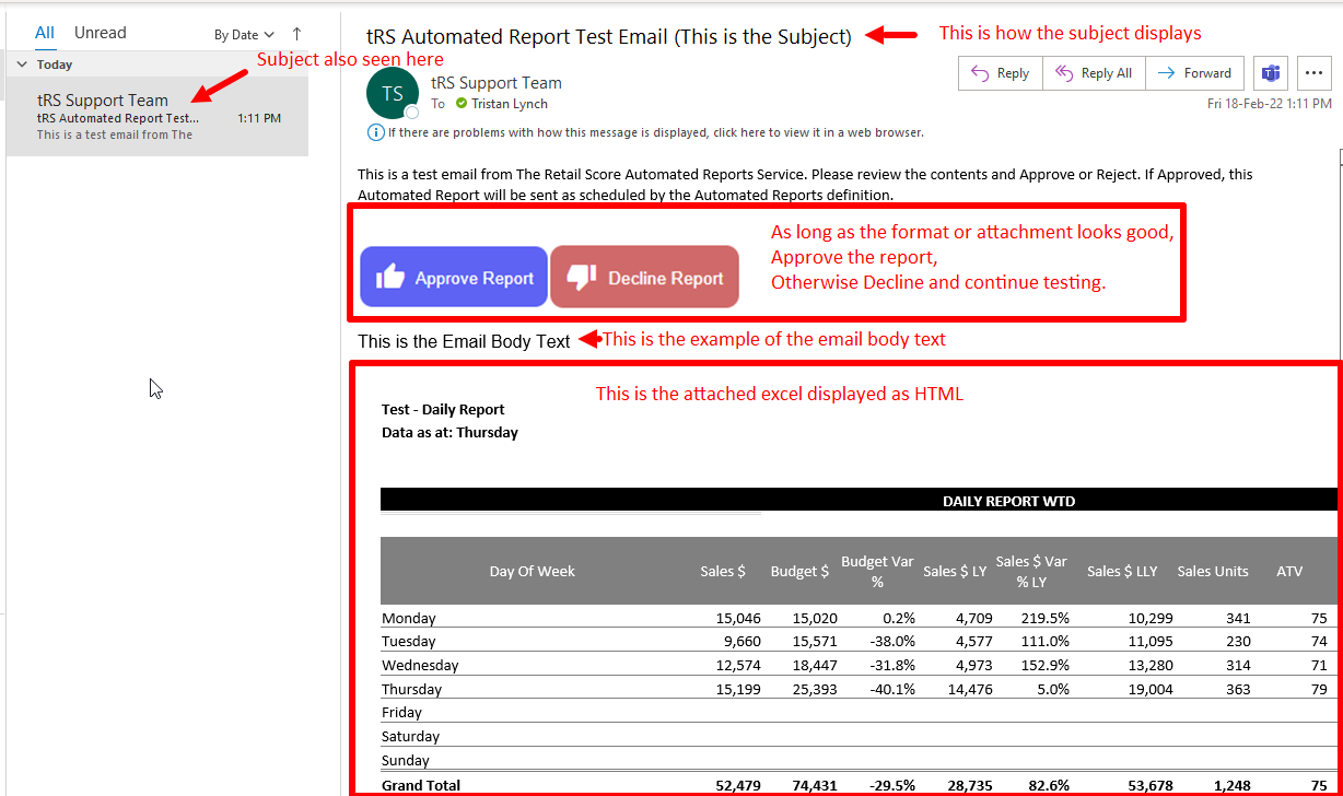 Below is an example of an automated report in testing, Once Approved it will send the exact same sample, without the testing details.