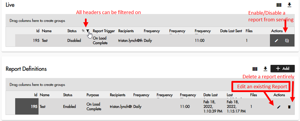 Once approved, the report will take you to the Live Tab, which shows you the current and finalised report that is scheduled and sending, you can deactivate the report from this page in the top left-hand corner.