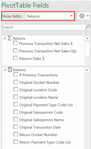 There is a table in the cube called "Returns", found under the 'Show Fields' drop down of your pivot table.