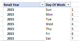 To check which day aligns with 1-7 you can check your cube, using [Retail Calendar] and [Day of Week]