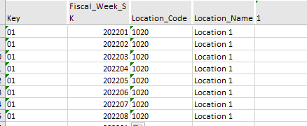 - Copy and paste the code and name as values into cells C and D and populate alongside your Fiscal weeks for each store.