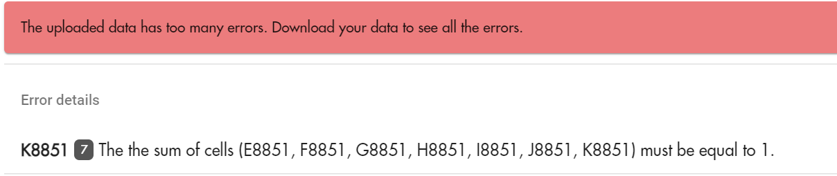 One of the most common upload errors is "the cells must = 1" (aka 100%)