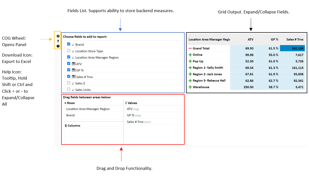 - Hovering over the grid, you will see a COG Wheel that opens/closes the Pivot Panel, a Download Icon that Exports to Excel, and a Tooltip.
