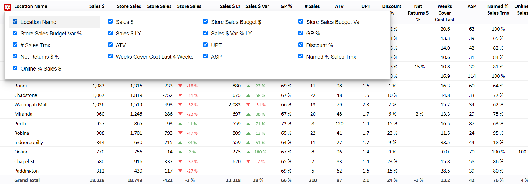 - Supports the ability to trim back measures (COG Wheel) but doesn't support adding and/or storing measures like that of the Pivot Panel.