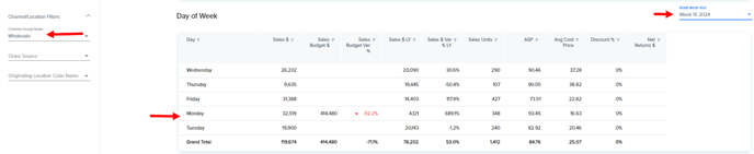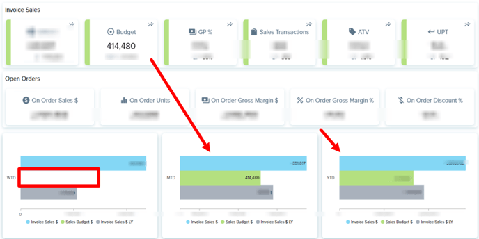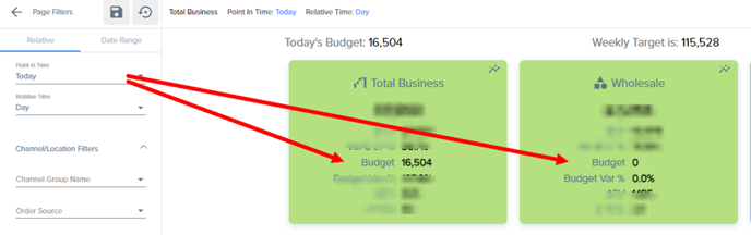 Here we can see for "today-day" the wholesale budget amount is 0 - as the monthly budget is not linked to the filtered on day.
